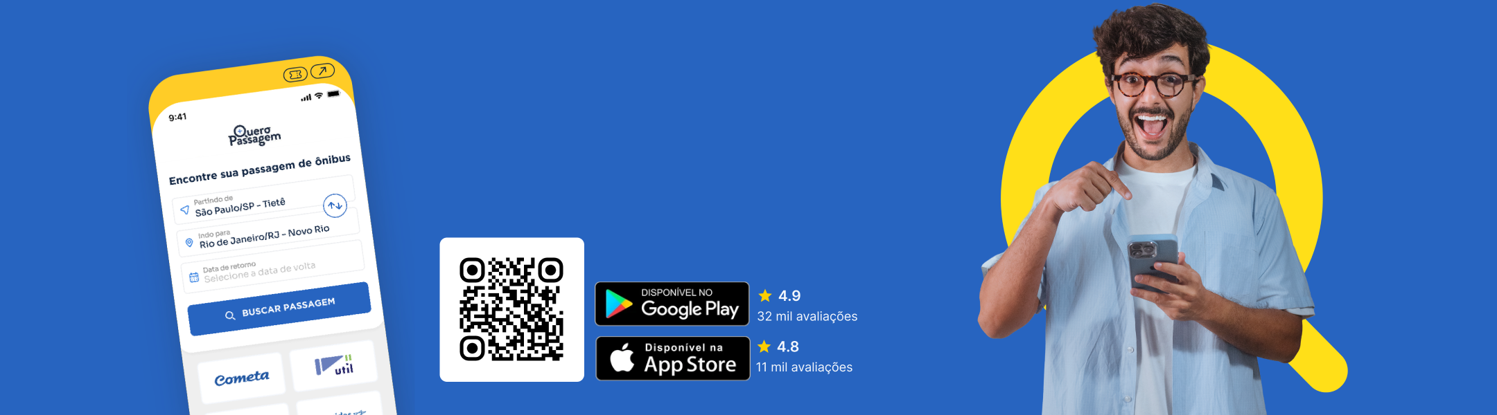 Viaje com conforto e segurança nas melhores companhias de ônibus do Brasil, como Viação Cometa, 1001, Catarinense, Itapemirim, Guanabara e outras 350 viações parceiras.